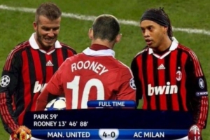 尷尬的是,這張圖片是一張P圖。2009-10賽季歐冠1/8決賽次回合,曼聯確實4-0擊敗了米蘭,但是魯尼在那場比賽打進2球,另外兩球是樸智星和弗萊徹打進,而且米蘭那場比賽身穿的是黑色球衣,也不是圖片里的紅黑間條衫。