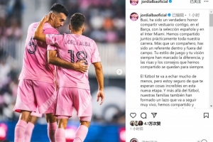 阿爾巴社媒曬出與布斯克茨的合照,并寫道:“布斯克茨,能與你在巴薩、西班牙隊以及邁阿密國際共用更衣室,這是我的莫大榮幸。我們幾乎整個職業生涯都并肩作戰。你不僅是隊友,更是場上場下的榜樣。你的球風與視野始終獨樹一幟,那些歡笑與建議將永遠銘刻于心。