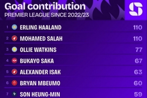 據Squawka的數據統計,自哈蘭德加盟曼城以來,他已經在英超聯賽直接參與110粒進球,同期沒有哪名球員比他更多,只有薩拉赫同樣參與110粒進球與他持平。