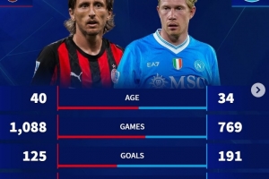 體育資訊9月28日訊 本輪意甲AC米蘭將迎戰那不勒斯,德轉也對比兩隊中場莫德里奇與德布勞內生涯數據,具體如下:
