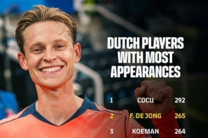 據巴薩官方數據統計,弗蘭基-德容為巴薩出戰場次已經達到265場,超越羅納德-科曼,成為代表巴薩出戰場次第二多的荷蘭球員,僅次于292場的科庫。