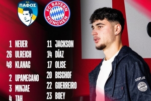 體育資訊9月29日訊 北京時間10月1日凌晨3:00,歐冠聯賽階段第2輪,拜仁將客戰帕福斯。今日,拜仁官方公布了本場比賽球隊大名單,凱恩領銜鋒線,比朔夫、博伊和格雷羅在列。