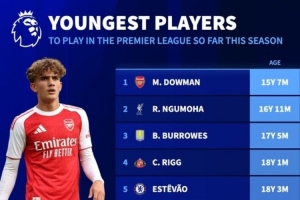 體育資訊9月13日訊 德轉列本賽季英超截止目前出場最年輕球員排行,道曼15歲7個月最年輕,恩古莫哈第二。