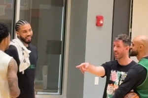 訓練間隙,塔圖姆與懷特和新援安芬尼-西蒙斯互相聊天。