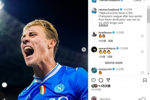 霍伊倫社媒曬出慶祝進球的照片,并發文調侃:“霍伊倫在歐冠比賽中梅開二度,還都是德布勞內的助攻——這完全不在我2025年的劇本之中。”