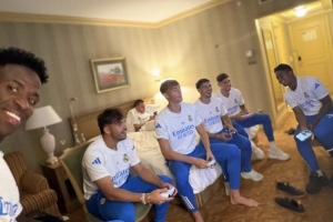 賽前,維尼修斯在社交媒體曬出球隊一起打游戲的照片,照片中迪亞斯、赫伊森等人在內。并配文:我的團隊??