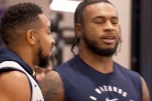 球隊新援CJ-麥科勒姆戴著麥克風上陣,作為老將的他積極鼓勵隊友。