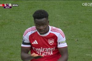 體育資訊10月04日訊 英超第7輪,阿森納vs西漢姆聯。比賽第60分鐘,薩卡被對手打到臉部,鼻子出了點血。
