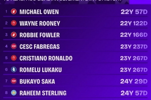 英超參與100球最年輕球員排名: