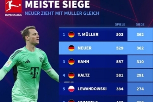 體育資訊10月5日訊 德轉統計了德甲球員獲勝場次排名,諾伊爾362場追平托馬斯-穆勒,并列第一。