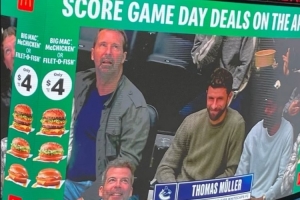 穆勒受邀觀看溫哥華加人隊(duì)的冰球比賽,并被現(xiàn)場大屏幕介紹。