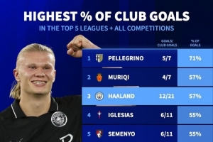 體育資訊10月7日訊 德國(guó)轉(zhuǎn)會(huì)市場(chǎng)統(tǒng)計(jì)了本賽季球員進(jìn)球占比,哈蘭德攻入曼城57%的進(jìn)球,占比并列第二高,姆巴佩54%、凱恩47%。