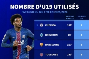 本賽季五大聯(lián)賽球隊(duì)使用U19球員數(shù)量排名(括號內(nèi)為平均出場時(shí)間):