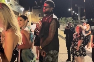 喬治在夜店門口排隊,還戴著護膝。身前站著的是他的妻子Daniela