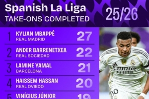 體育資訊10月7日訊 日前,Squawka統計了本賽季西甲過人次數排行,姆巴佩以27次過人居首。