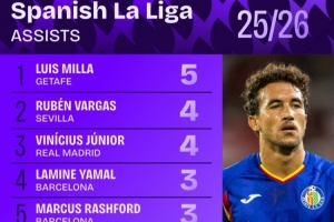 體育資訊10月7日訊 日前,Squawka統(tǒng)計了本賽季西甲助攻榜,維尼修斯并列第2,亞馬爾、拉什福德、居勒爾并列第4。