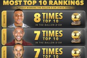 體育資訊10月07日訊 據外媒score90統計,姆巴佩8次入圍金球獎前十,但從未獲獎,歷史最多。