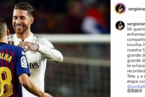 體育資訊10月8日訊 西班牙邊衛阿爾巴將在本賽季結束后退役,拉莫斯社媒發文致敬。