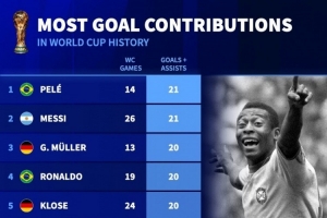 體育資訊10月8日訊 德國轉會市場統計了球員在世界杯(決賽圈階段)參與進球的數量,并列出榜單,貝利、梅西參與21球并列居首。