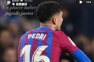 佩德里社媒曬出與阿爾巴慶祝的合照,配文:“很榮幸曾與你并肩作戰,場上的偉大球員,場下的天才人物。”
