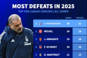 體育資訊10月9日訊 接替努諾成為諾丁漢森林主帥后,波斯特科格魯未能提升球隊表現(xiàn),反而讓球隊進一步陷入泥沼。根據(jù)德國轉(zhuǎn)會市場的統(tǒng)計,波斯特科格魯是五大聯(lián)賽今年輸球最多的主教練,達到了21場,而曼聯(lián)主帥阿莫林以15場并列第4。