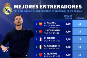 體育資訊10月10日訊 德國轉會市場統(tǒng)計了2000年以來皇馬主帥前16場比賽的勝利場次,并列出榜單,阿隆索13勝居首,穆里尼奧、齊達內、安切洛蒂12勝。