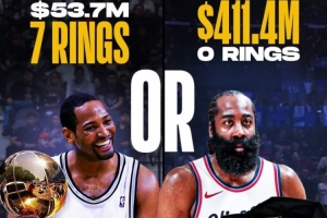 詹姆斯-哈登的(薪資)收入已經(jīng)超過了4.11億美元,但NBA生涯至今冠軍數(shù)仍是0。
