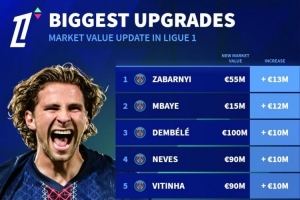 體育資訊10月12日訊 德國轉會市場更新法甲球員的身價,并列出身價上漲榜單,扎巴爾尼+1300萬歐居首,巴黎球員占據前7名。