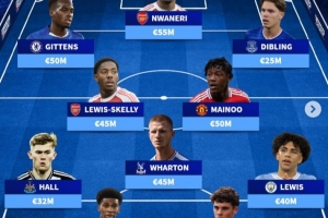 中場:沃頓(水晶宮,4500萬歐)、劉易斯-斯凱利(阿森納,4500萬歐)、梅努(曼聯,5000萬歐)