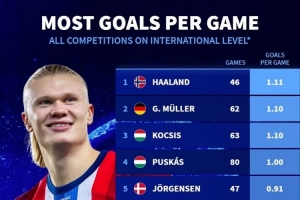 體育資訊10月13日訊 德國轉會市場統計了足壇歷史球員在國家隊的場均進球數量,并列出榜單,哈蘭德1.11球居首,蓋德-穆勒、柯奇士次席。