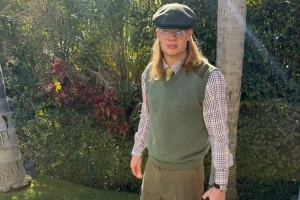 哈蘭德社媒曬出穿搭照片,背景是郁郁蔥蔥的綠色植被,哈蘭德頭戴綠色帽子,身上穿著綠色馬甲,內(nèi)搭格子襯衫,下身穿著橄欖綠褲子,手拎黑綠色帆布包包。