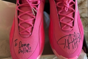 字母哥給利拉德的是他最新發(fā)布的簽名鞋F(xiàn)reak 7,字母哥也貼心的簽上了“to簽”,寫了利拉德的外號(hào)“Dame Dolla”。
