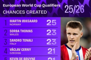 體育資訊10月15日訊 據(jù)Squawka統(tǒng)計,厄德高是本屆歐洲世預賽創(chuàng)造機會最多的球員。