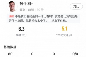體育資訊9月15日訊 英超曼市德比,曼聯前鋒舍什科首發出戰,球員本場數據如下: