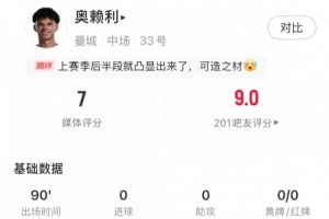 體育資訊9月15日訊 英超第4輪曼市德比,曼城主場3-0擊敗曼聯,奧賴利此役出任曼城左后衛打滿全場,球員數據如下: