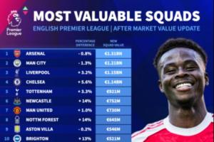 最新英超俱樂部球員身價排名(單位:歐元):