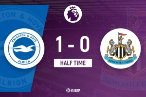 傷停補時5分鐘。上半場比賽結束,布萊頓1-0紐卡斯爾。