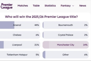 英超官網(wǎng)表示,這可能是英超有史以來最精彩的冠軍爭奪戰(zhàn)之一。他們發(fā)起了“誰能最終奪冠?”的球迷投票,槍手最被看好,他們的得票率高達(dá)44%。紅軍曼城緊隨其后。