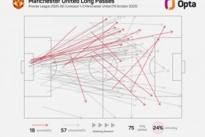 據Opta統計,曼聯本場比賽傳球294次,其中有75次長傳,占比25.5%、2017年12月3-1擊敗阿森納(占比27.9%)之后,這是曼聯在英超長傳占比最高的比賽。