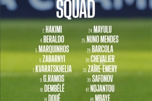 前鋒:7-克瓦拉茨赫利亞、9-貢薩洛-拉莫斯、10-登貝萊、14-杜埃、19-李剛仁、29-巴爾科拉、恩賈恩圖、49-姆巴耶