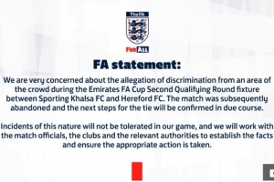 Sporting Khalsa隨后也發布了一份聲明,稱在對陣Hereford的足總杯比賽中,下半場發生了針對其守門員Ravan Constable的種族歧視言論。