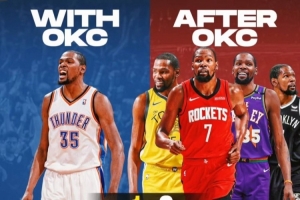 杜蘭特雷霆生涯1次MVP、0冠軍、總得分17566;后雷霆生涯杜蘭特0次MVP、2冠軍、總得分12955。