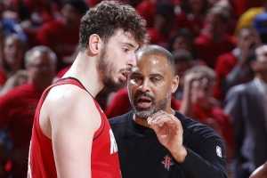 體育資訊10月22日訊 NBA常規(guī)賽揭幕戰(zhàn),火箭對(duì)陣?yán)做谋荣愐呀?jīng)進(jìn)行到末節(jié)。