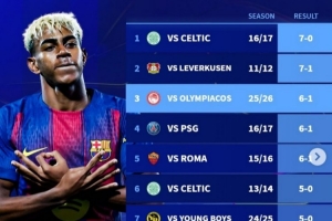 體育資訊10月22日訊 在本輪歐冠,巴薩6-1大勝奧林匹亞科斯。德轉也盤點了巴薩隊史在歐冠最大比分獲勝紀錄榜,具體如下: