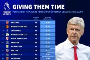 體育資訊10月22日訊 《轉會市場》統(tǒng)計了英超各隊的歷任正式主教練平均執(zhí)教年限情況,阿森納無懸念居首。