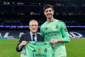 庫爾圖瓦達成皇馬生涯出戰(zhàn)300場里程碑,俱樂部主席弗洛倫蒂諾向他頒發(fā)了紀念球衣。