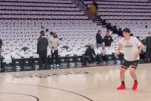 賽前,楊瀚森身穿中國紅戰靴進行投籃熱身。