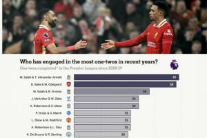 TA統計2018/19賽季以來英超二過一配合次數榜單↓