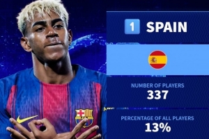 體育資訊9月16日訊 德國轉(zhuǎn)會(huì)市場統(tǒng)計(jì)了五大聯(lián)賽各國球員的數(shù)量,并列出榜單,西班牙337人居首。