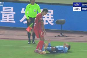 體育資訊10月25日訊 河南vs浙江第23分鐘,張璦暉倒地夾住皮球,王上源上去對著皮球一通踢。